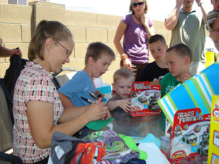 It's been 3 years in the making, and we are about 70% done with our backyard. Most recently Brian put in the playground area for the boys and wants to add on a tube slide and a tire swing. We are planning to put in a garden with numerous vegetables, as well as a "built in" BBQ along side of the deck, who knows when that is gonna happen with the prices of everything going up everyday. Oh well, we sure are enjoying what we already have, and are outside almost everyday/evening. This year so far seems to be more enjoyable than years past due to the fact that we aren't getting eatten alive by moquitoes. Those of you who live in Coolidge know what I mean!